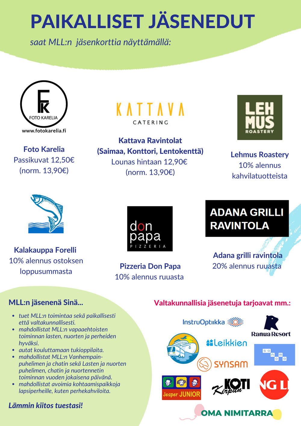 Valtakunnallisiin jäsenetuihin voit tutustua tarkemmin MLL:n keskusjärjestön nettisivuilla!