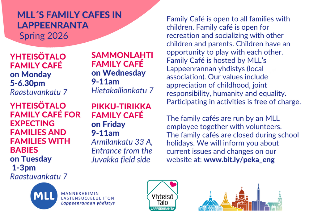 Family Café is open to all families with children. Family café is open for recreation and socializing with other children and parents. Children have an opportunity to play with each other. Family Café is hosted by Mannerheimin Lastensuojeluliiton Lappeenrannan yhdistys (local association). Our values include appreciation of childhood, joint responsibility, humanity and equality. Cooperation is our main method and we act with joy. Participating in activities is free of charge. Spoken languages are Finnish and English.